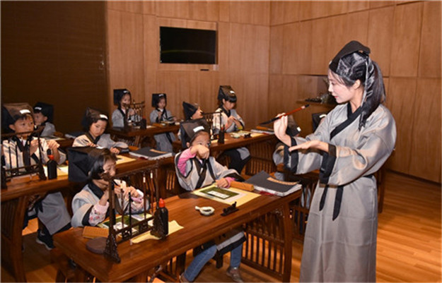 國學課堂上書法的教學,張弛有度的筆法,包含著人生哲理,